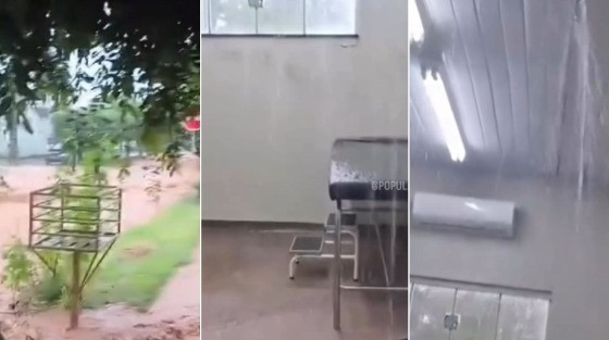 Vídeos que circulam nas redes sociais mostram a água tomando as ruas e calçadas, e chuva infiltrando pelo forro de PVC da policlínica, formando verdadeiras cachoeiras dentro da unidade de saúde.