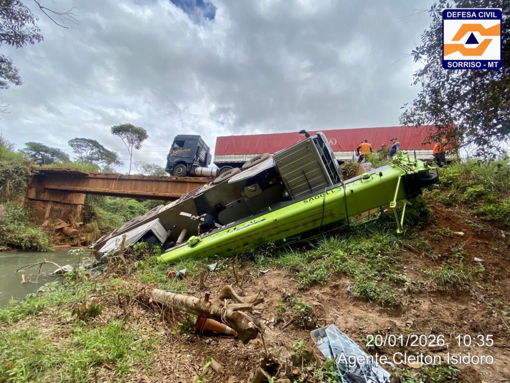 A Prefeitura de Sorriso informou que equipes da Defesa Civil estiveram no local para atendimento da ocorrência, avaliação dos danos e definição das medidas de segurança, incluindo a necessidade de interdição durante a retirada do guindaste e do veículo.